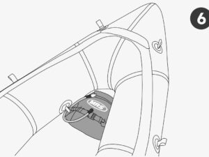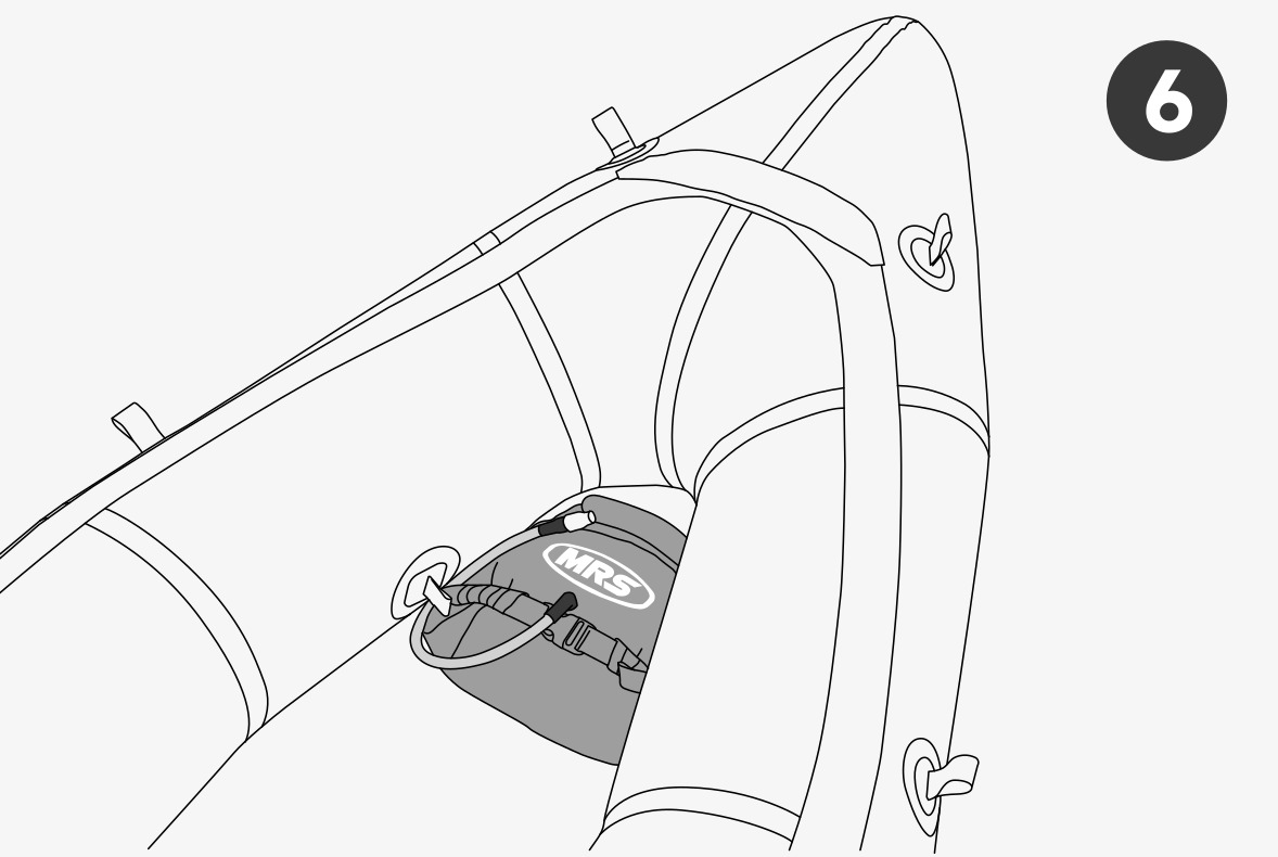 Die meisten MRS Packrafts verfügen bereits im vorderen Bereich über passende Befestigungspunkte. Dadurch kann die Fussstütze mit den an ihr angebrachten Klettriemen direkt und sicher fixiert werden.