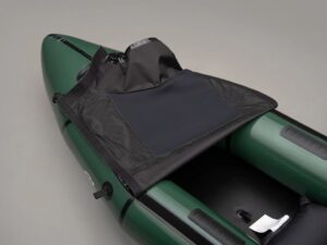 Hinter der Rückenlehne ist reichlich Platz für einen mittelgrossen Rucksack und/oder Trockensäcke. Der Zugang zu diesem Stauraum erfolgt durch teilweises Öffnen der Spritzdecke (wie eine Luke) im hinteren Teil des Packrafts. Ebenfalls kann zusätzliches Gepäck an den jeweils vier Haltepunkten auf Bug und Heck festgebunden werden.